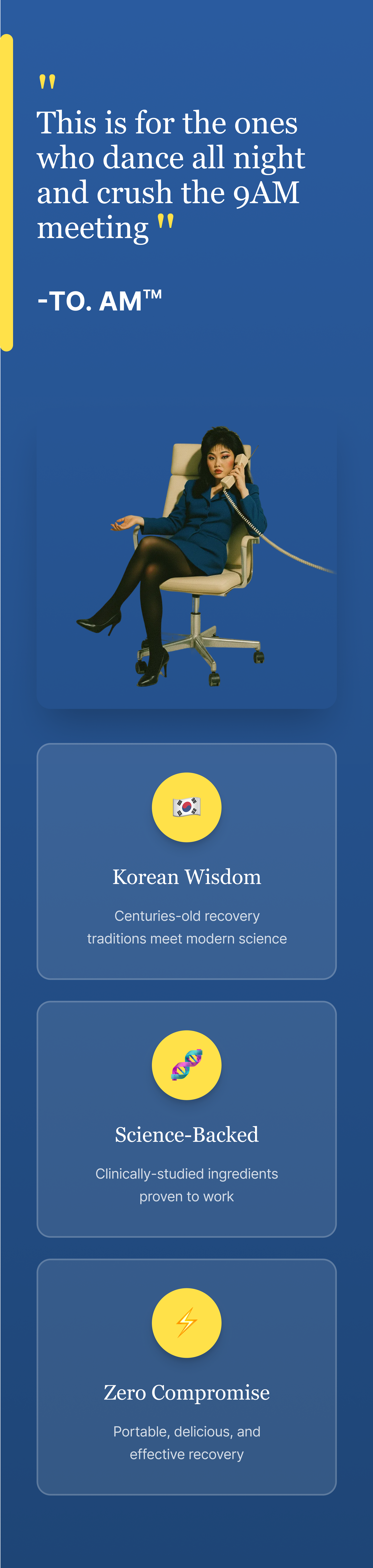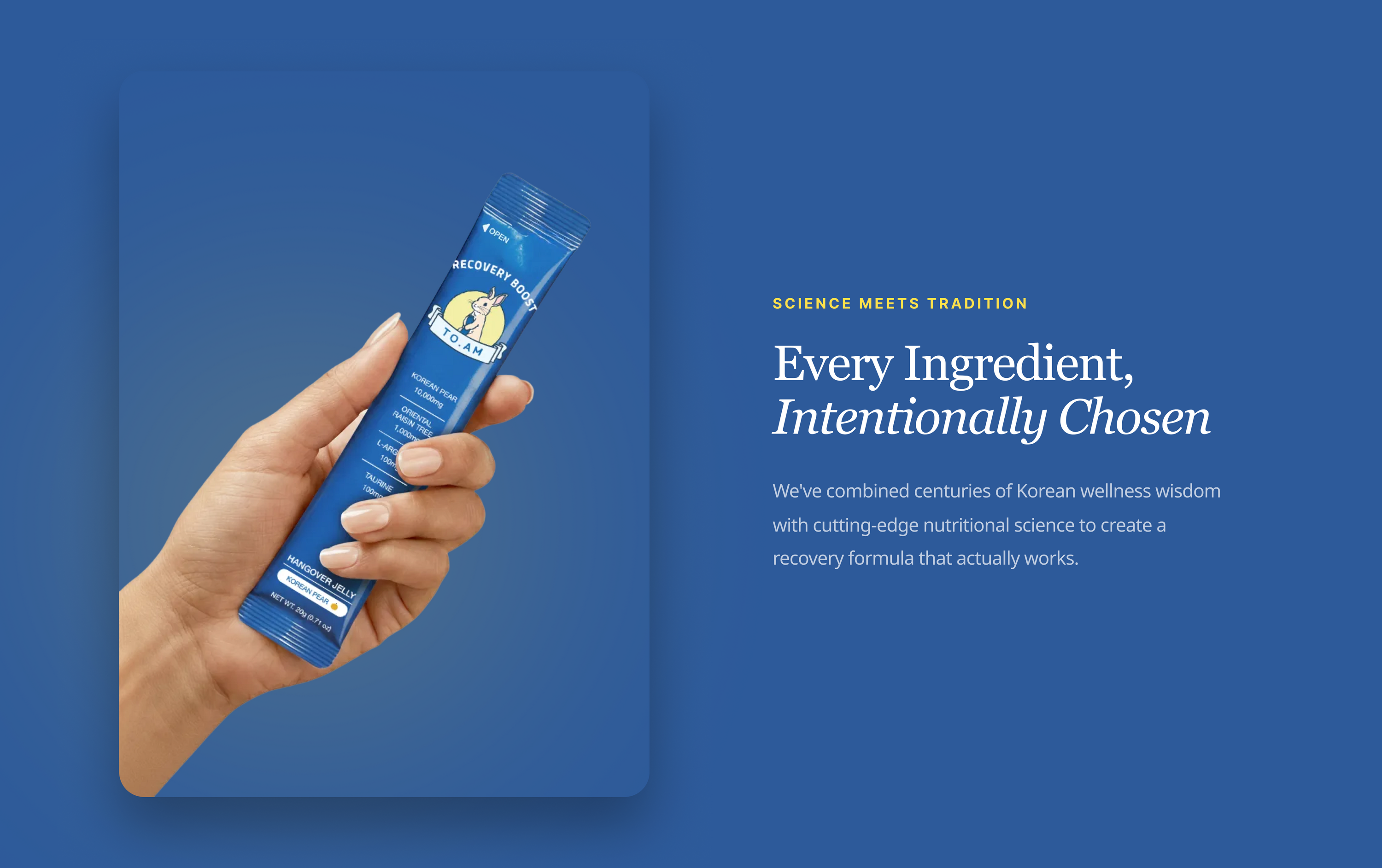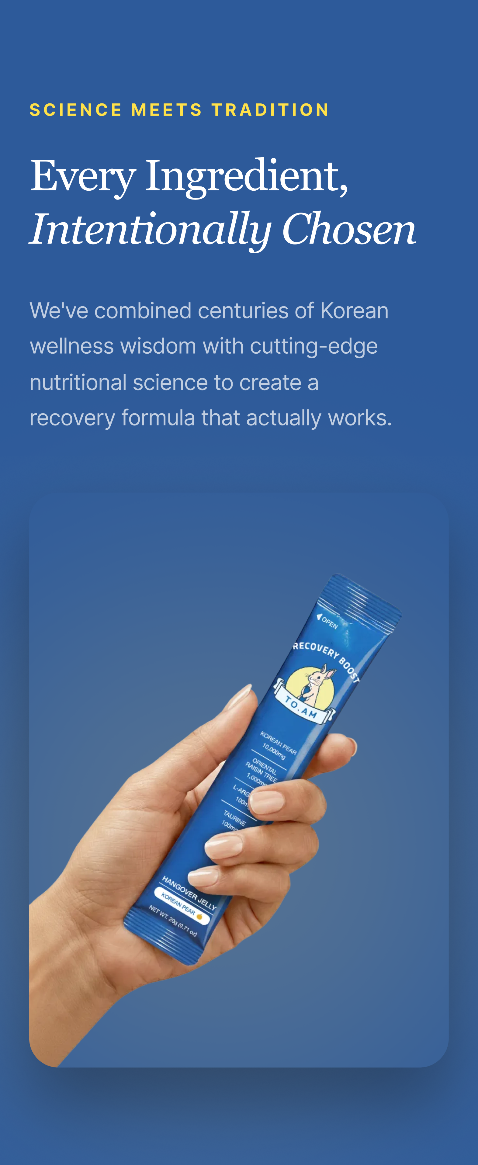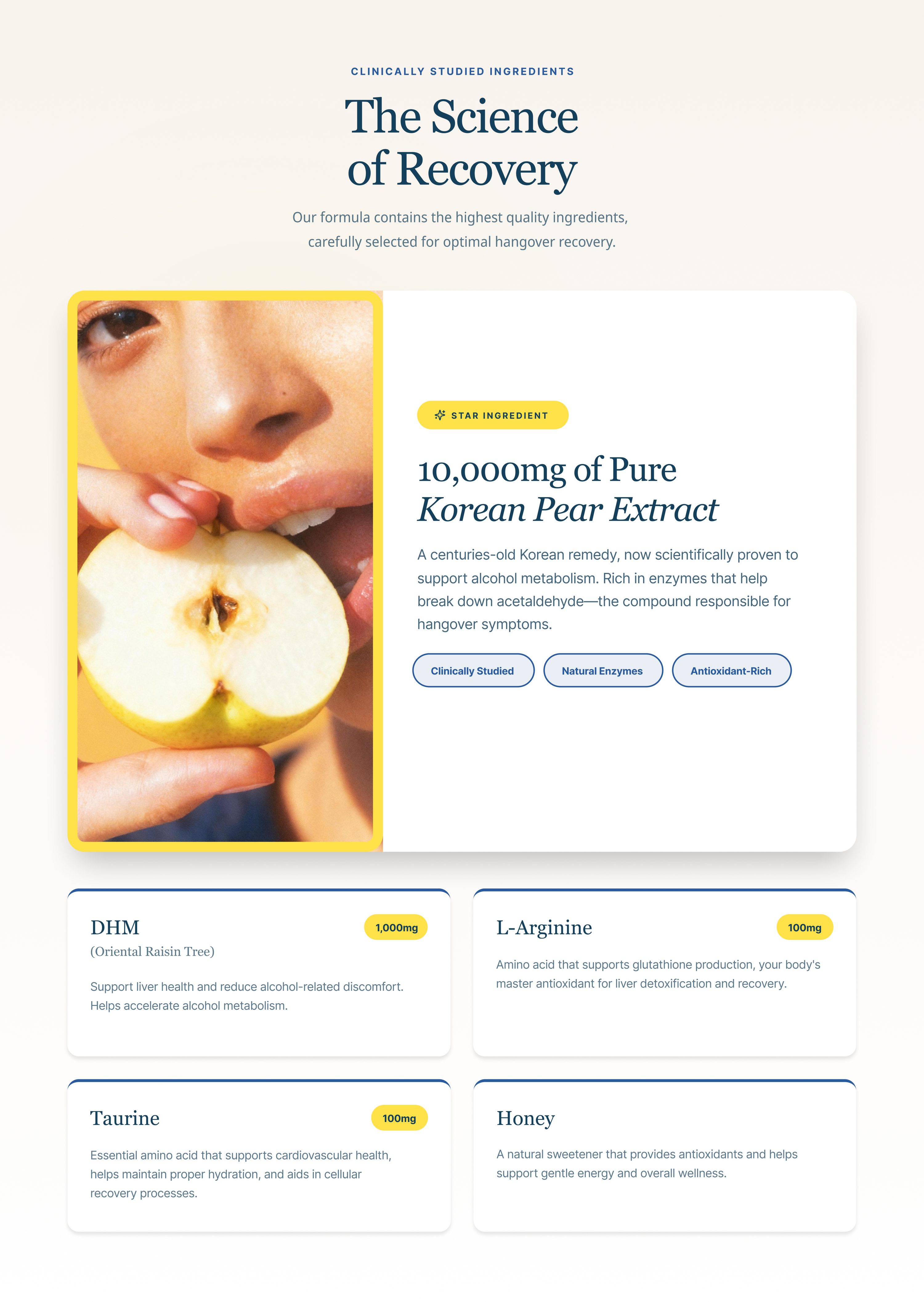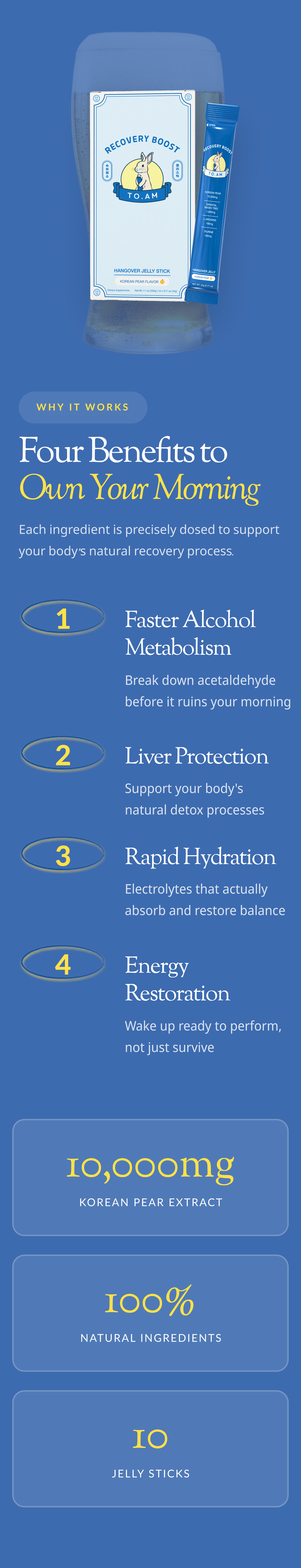 Science class, but make it fun. When you drink, your body produces acetaldehyde — basically a toxic byproduct that's responsible for that next-day "why did I do this" feeling. DHM (1,000mg) helps your liver break it down faster so it doesn't wreck your morning. Korean pear has been doing the heavy lifting in Korean wellness culture for generations, supporting how your body processes alcohol. Taurine and L-Arginine keep your circulation and cells happy, while Vitamin C mops up the oxidative stress. Think of TO. AM as your body's cleanup crew — working hard so you feel fresh the next morning. 🍐⚡