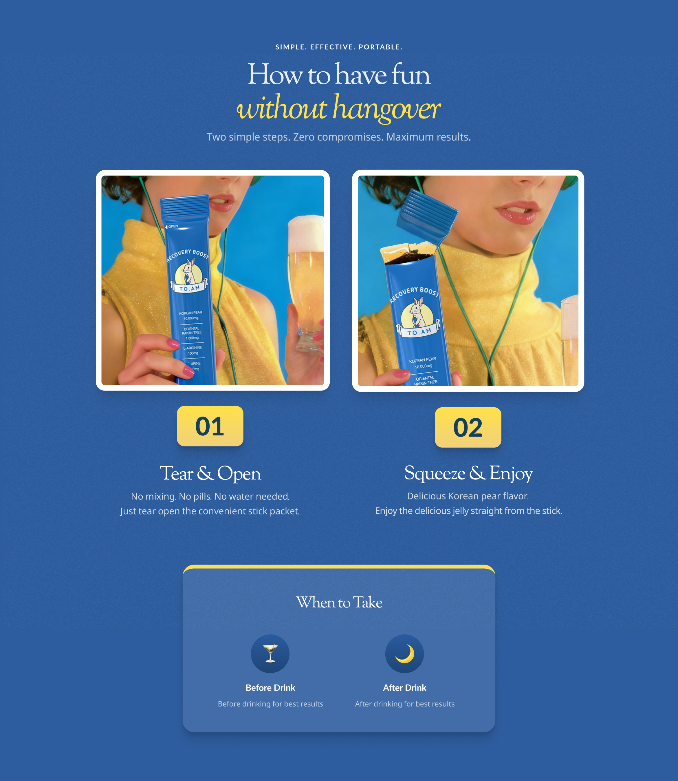 Meet your new going-out essential. TO. AM is a Korean hangover prevention jelly stick packed with 10,000mg of Korean pear, 1,000mg of DHM, L-Arginine, Taurine, Honey, and Vitamin C. Inspired by Korea's age-old secret to feeling great the morning after. Take it before or after your night out, wake up actually feeling like yourself. 🍐✨