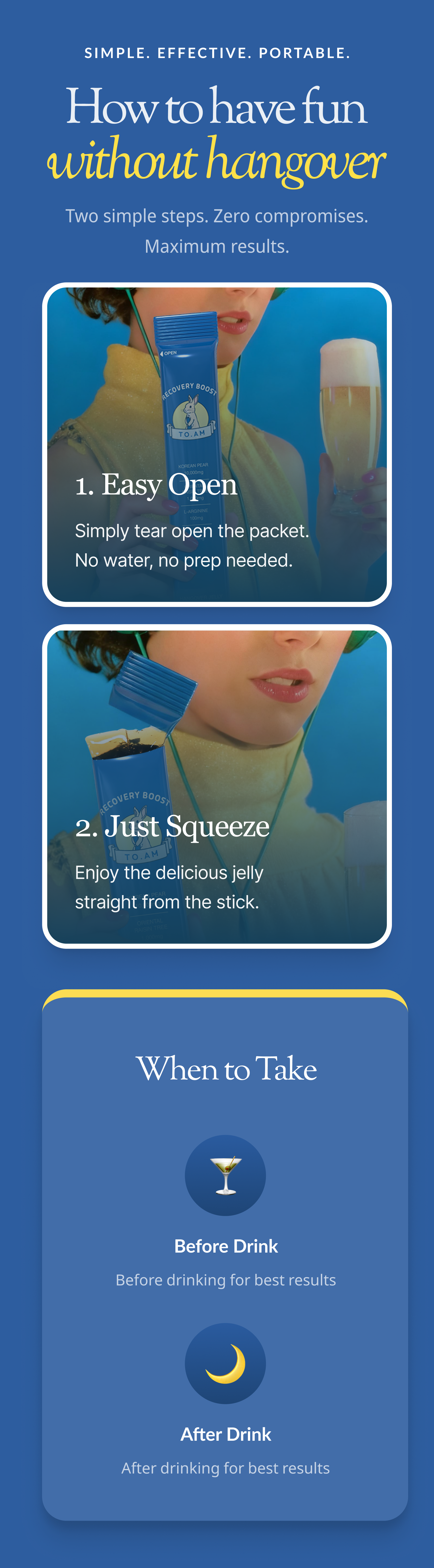 Take one jelly stick before or after drinking — ideally at the start of your evening. For longer nights, take two. No water or mixing needed. Just tear, squeeze, and enjoy.